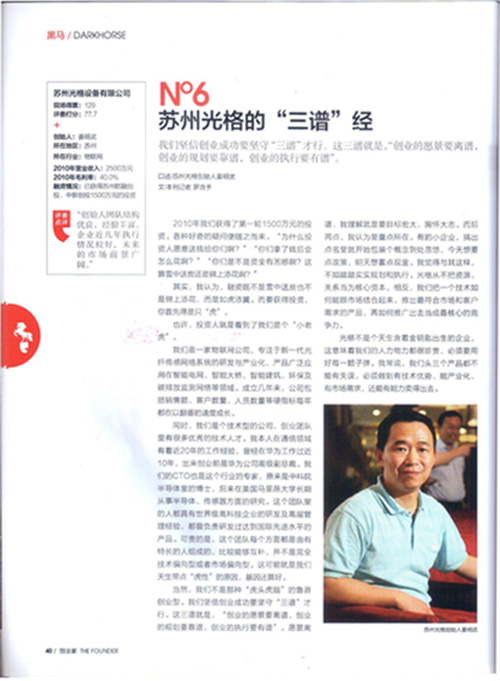 2011年8月,《創(chuàng )業(yè)家》雜志第36期報道了《黑馬十強 No6蘇州光格的“三譜”經(jīng)》的文章,文章中所指出的三譜就是,“創(chuàng )業(yè)的愿景要離譜,創(chuàng )業(yè)的規劃要靠譜,創(chuàng )業(yè)的執行要有譜”。文章的全文如下圖所示: